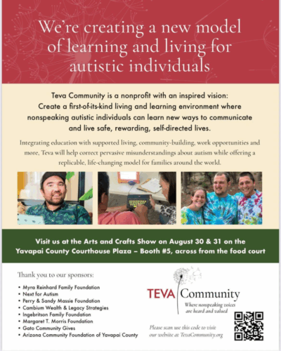 “At Teva Community, we’re creating a new model for learning and living for nonspeaking autistic individuals who communicate by spelling and typing. We will offer education, retreats, professional trainings, and special events. We are also creating a safe, self-directed living community for autistic adults on 35 acres in the beautiful Prescott National Forest. We envision a world where all nonspeaking people are listened to, valued and fully included in all aspects of society.”